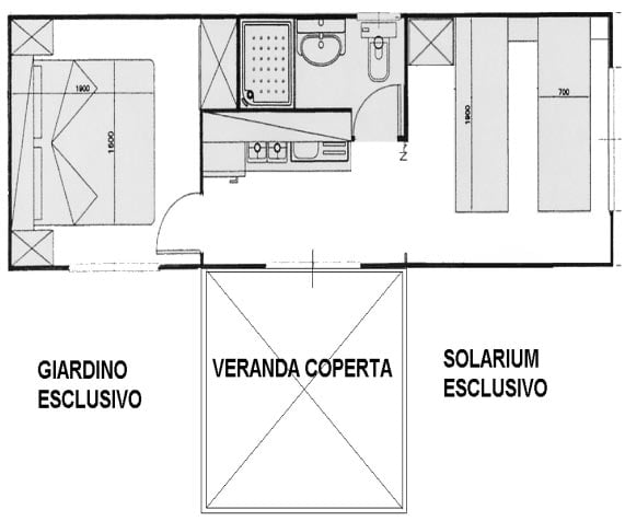 - una camera con letto matrimoniale, angolo cottura con lavello e frigo, bagno con wc, lavabo e doccia, unità completamente arredata e compresa attrezzatura da cucina.